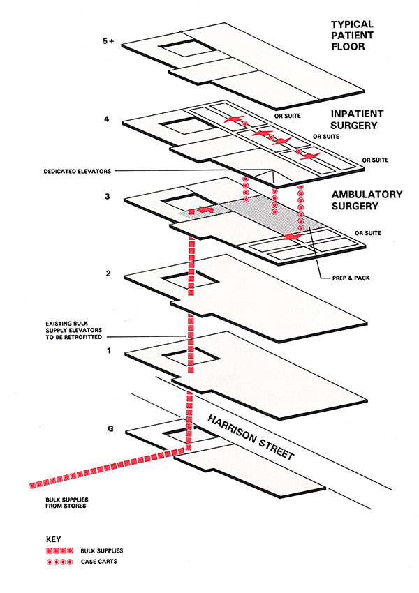 In the implementation phase, the specific requirements of the selected system are developed. The system requirements may include, but are not limited to, movement and volume schedules; traffic patterns; shift and staffing requirements; equipment and transport system needs (elevator, dumbwaiter, pneumatic tubes); and quantification and arrangement of space.